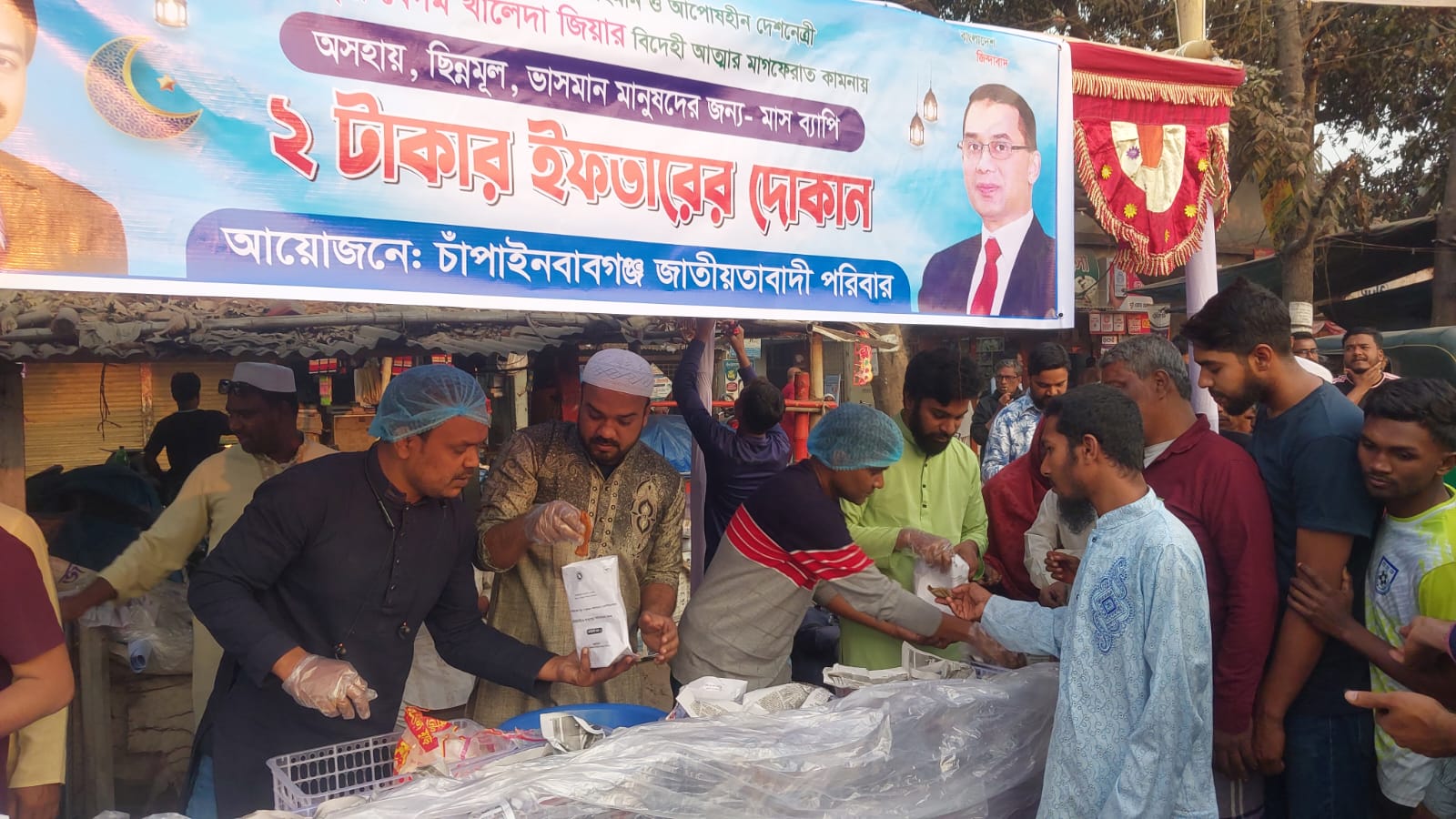 চাঁপাইনবাবগঞ্জ শহরের ব্যস্ত বিশ্বরোড মোড়ে, রাজশাহী-চাঁপাইনবাবগঞ্জ মহাসড়কের পাশে পথচারীদের জন্য ব্যতিক্রমী ইফতার আয়োজন করেছে চাঁপাইনবাবগঞ্জ জাতীয়তাবাদী পরিবার। সড়কের পাশে টেবিলে সাজানো পেয়াজু, বেগুনি, ছোলা, জিলাপি ও কলাসহ বিভিন্ন পদের ইফতার মাত্র দুই টাকায় বিক্রি করা হচ্ছে। পথচারী, রিকশাচালক ও সাধারণ মানুষ স্বল্পমূল্যে ইফতার সংগ্রহ করে স্বস্তি প্রকাশ করছেন।