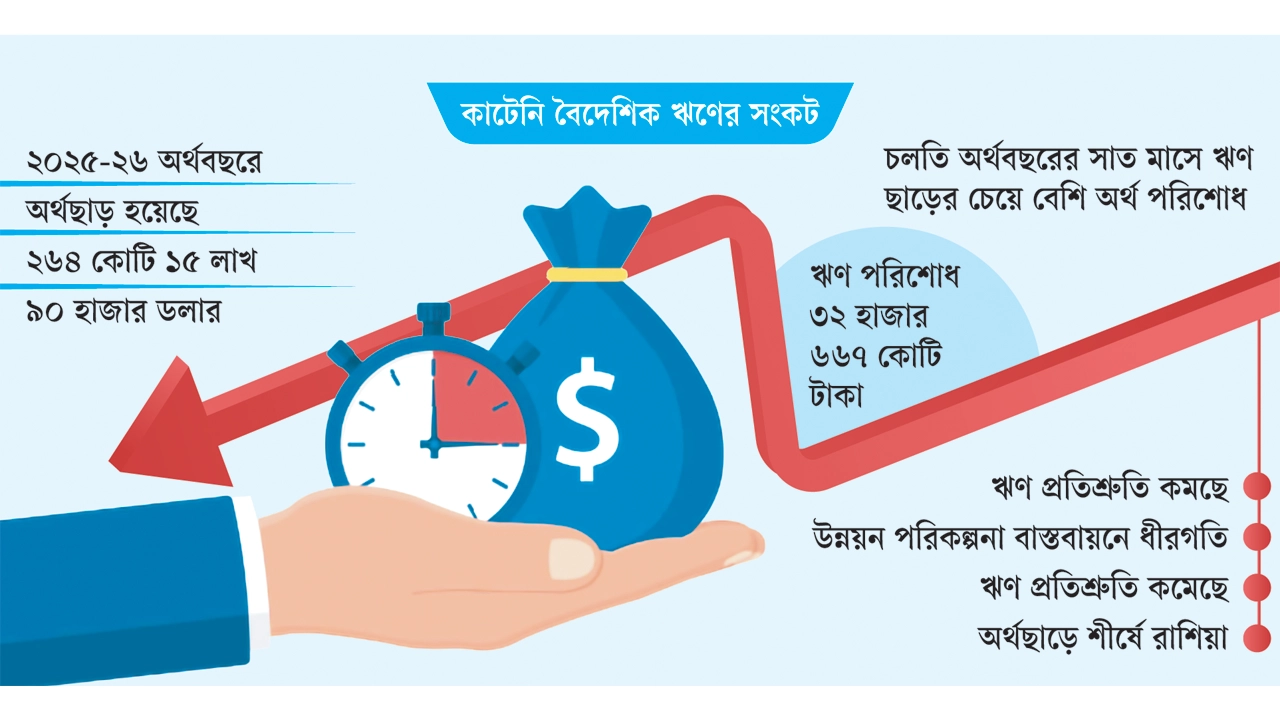 বৈদেশিক ঋণের সংকট কাটিয়ে উঠতে পারছে না সরকার। দুই বছর ধরে বৈদেশিক ঋণ ও প্রতিশ্রুতি কমিয়ে দিয়েছে উন্নয়ন সহযোগী দেশ ও সংস্থা। বিপরীতে বেড়ে গেছে আগের নেওয়া ঋণের সুদ ও আসল পরিশোধের চাপ। ঋণের অর্থছাড় কমার কারণে উন্নয়ন সহযোগীদের কাছ থেকে আগের নেওয়া ঋণের সুদ ও আসল পরিশোধ করতে গিয়ে দেশের অর্থনীতি চাপের মধ্য দিয়ে যাচ্ছে। যার ফলে সরকারের উন্নয়ন পরিকল্পনা বাস্তবায়নও অনেকটা থমকে গেছে। অর্থনৈতিক সম্পর্ক বিভাগের (ইআরডি) তথ্য বলছে, চলতি ২০২৪-২৫ অর্থবছরের প্রথম সাত মাসে (জুলাই-জানুয়ারি) প্রতিশ্রুত ঋণের অর্থ পাওয়া গেছে ২৬৪ কোটি ১৫ লাখ ৯০ হাজার ডলার। বিপরীতে সুদ ও আসল পরিশোধ করতে হয়েছে ২৬৭ কোটি ৬৮ লাখ ১০ হাজার ডলার। অর্থাৎ যে পরিমাণ ঋণ পাওয়া গেছে তার চেয়ে বেশি অর্থ সুদ ও আসল পরিশোধে ব্যয় হয়েছে। চলতি অর্থবছরে এখন পর্যন্ত প্রতিশ্রুত ঋণের অর্থছাড় হয়েছে ২৬৪ কোটি ১৫ লাখ ৯০ হাজার ডলার। এর মধ্যে ঋণ হিসেবে পাওয়া গেছে ২৩৯ কোটি ৬৪ লাখ ৫০ হাজার ডলার। আর অনুদান হিসেবে পাওয়া গেছে ২৪ কোটি ৫১ লাখ ৪০ হাজার ডলার। ২০২৪-২৫ অর্থবছরের প্রথম সাত মাসে অর্থছাড় হয়েছিল ৩৯৩ কোটি ৮৮ লাখ ৯০ হাজার ডলার। এর মধ্যে ঋণ হিসেবে পাওয়া গিয়েছিল ৩৬৬ কোটি ৩৯ লাখ ৭০ হাজার ডলার। আর অনুদান হিসেবে এসেছিল ২৭ কোটি ৪৯ লাখ ২০ হাজার ডলার।