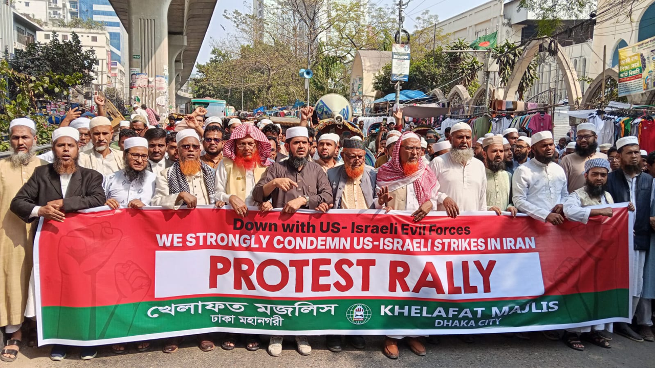 ইরানে যুক্তরাষ্ট্র ও ইসরাইলের যৌথ বিমান হামলার প্রতিবাদে রাজধানী ঢাকায় বিক্ষোভ মিছিল ও সমাবেশ করেছে খেলাফত মজলিস।