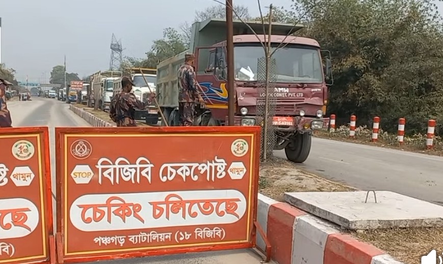 শনিবার (৭ মার্চ) সকাল থেকে পঞ্চগড় ১৮ বিজিবি ব্যাটালিয়নের উদ্যোগে দেশের একমাত্র চতুর্দেশীয় বাংলাবান্ধা স্থলবন্দরসহ বিভিন্ন সীমান্ত পয়েন্টে এই তৎপরতা শুরু হয়। বিজিবি জানায়, সদর দপ্তরের নির্দেশনা অনুযায়ী সীমান্তের গুরুত্বপূর্ণ স্থানে চেকপোস্ট বসিয়ে সন্দেহভাজন যানবাহন ও মালামাল তল্লাশি করা হচ্ছে। একই সঙ্গে ইমিগ্রেশন চেকপোস্ট দিয়ে যাতায়াতকারী যাত্রীদের ওপরও কড়া নজরদারি চালানো হচ্ছে।