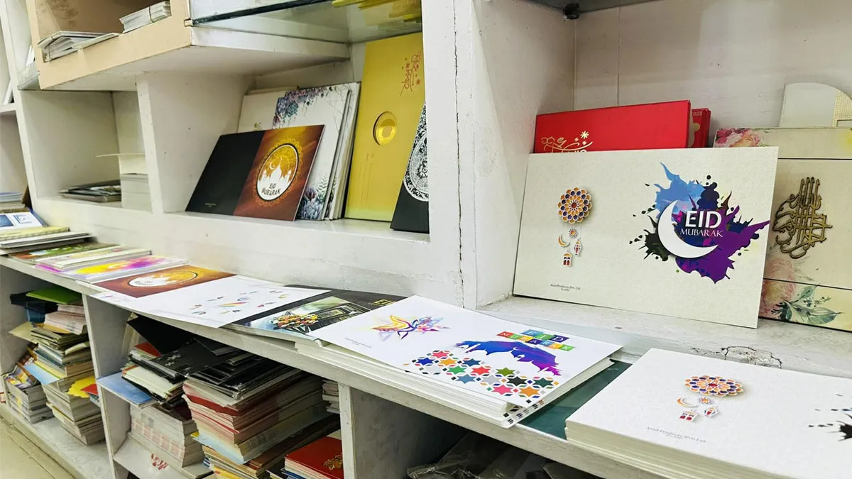 এভাবেই কালের খেয়ায় হারিয়ে যাওয়া ঈদের শুভেচ্ছা কার্ডের জৌলুস থাকা দিনের স্মৃতিচারণ করছেন রাজধানীর আজাদ প্রোডাক্টসের বিক্রেতা আলী আজম।