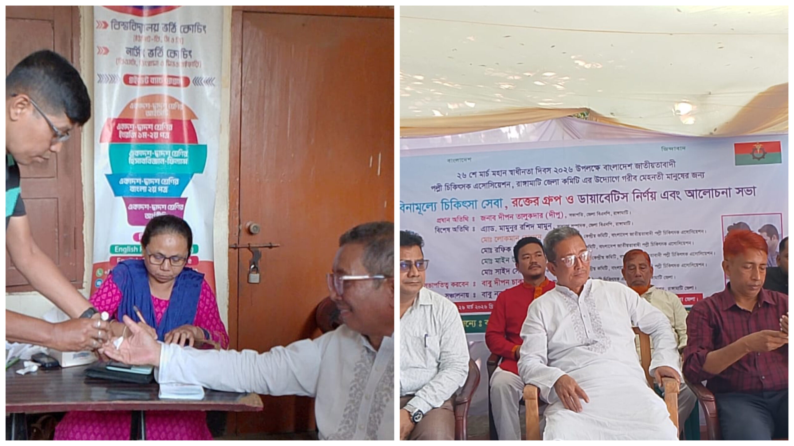 মহান স্বাধীনতা দিবস ২০২৬ উপলক্ষে বাংলাদেশ জাতীয়তাবাদী পল্লী চিকিৎসক এসোসিয়েশন, রাঙ্গামাটি পার্বত্য জেলা শাখার উদ্যোগে গরিব ও মেহনতী মানুষের জন্য বিনামূল্যে চিকিৎসা সেবা, রক্তের গ্রুপ নির্ণয়, ডায়াবেটিস পরীক্ষা এবং এক আলোচনা সভা অনুষ্ঠিত হয়েছে।