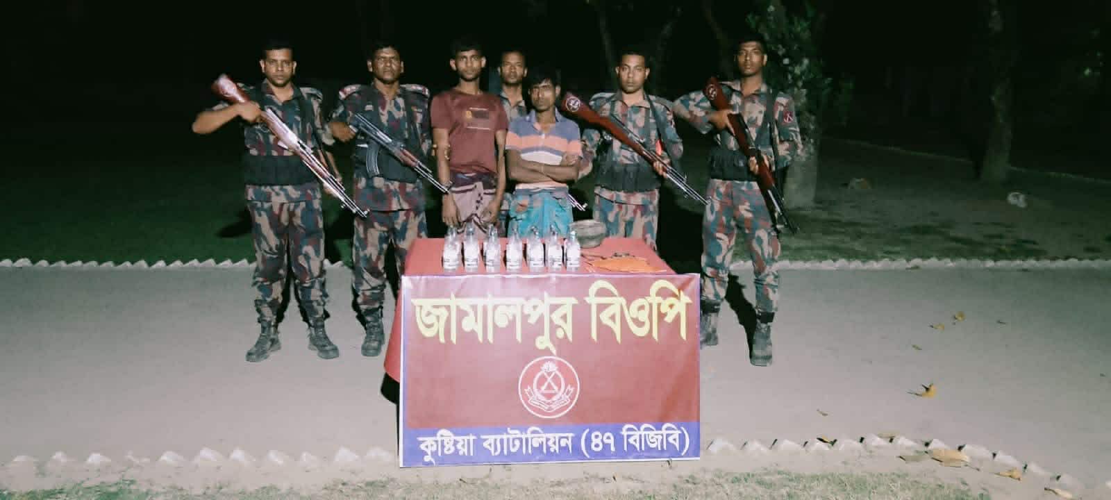 শুক্রবার দুপুরে বিজিবি জানায়, গোয়েন্দা তথ্যের ভিত্তিতে কুষ্টিয়া ব্যাটালিয়ন (৪৭ বিজিবি)-এর আওতাধীন জামালপুর বিওপির একটি টহল দল বৃহস্পতিবার গভীর রাতে সীমান্ত পিলার ১৫৩/এমপি সংলগ্ন কান্দিরপাড়া এলাকায় অভিযান চালায়। বাংলাদেশের অভ্যন্তরে প্রায় ১০ গজ ভেতরে পরিচালিত এ অভিযানে মো. মিঠুন মন্ডল (৩৫) ও শহীদ হোসেন (২৫) নামে দুই ব্যক্তিকে আটক করা হয়। এ সময় তাদের কাছ থেকে ২০ বোতল মদ, ৪০০ পিস সিপ্রোহেপ্টাডিন ট্যাবলেট এবং ১০ পিস ট্যাপেন্টাডল ট্যাবলেট উদ্ধার করা হয়।