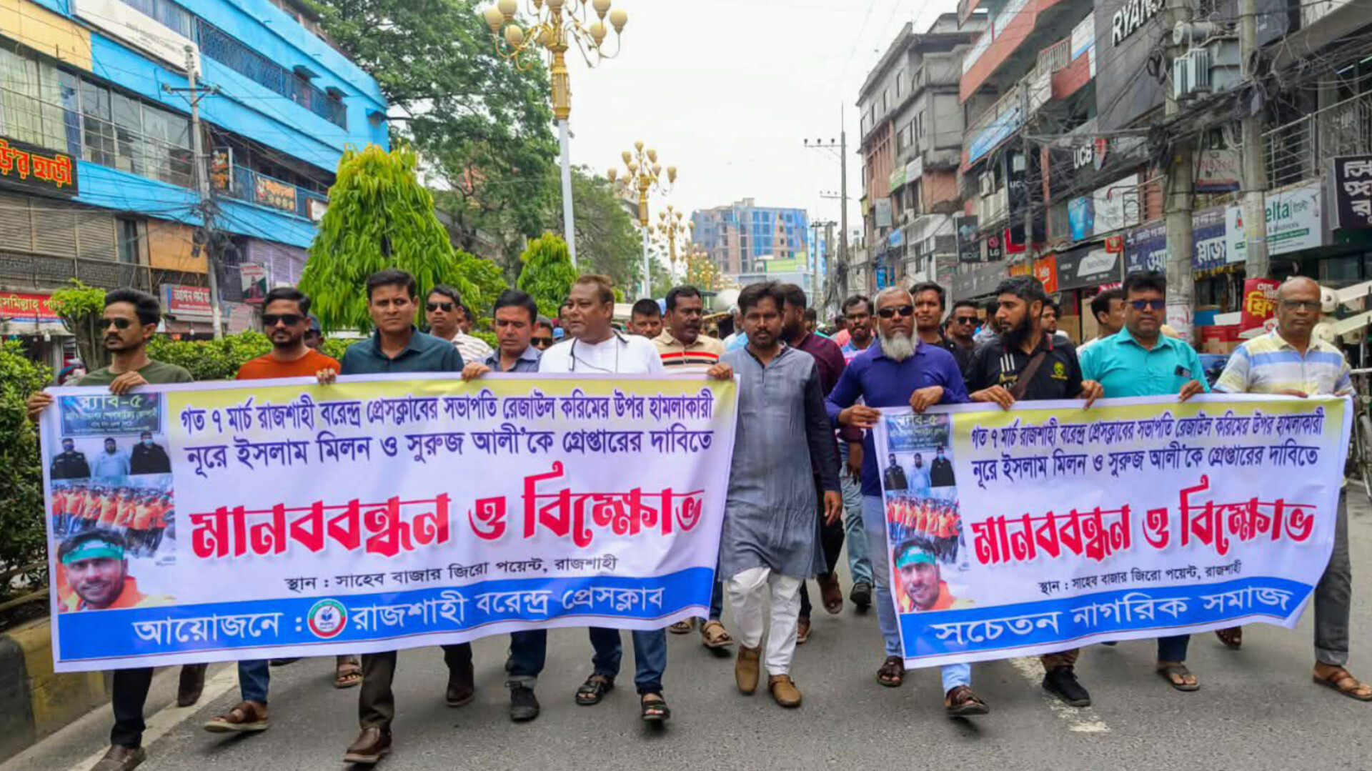 রাজশাহী বরেন্দ্র প্রেসক্লাবের সভাপতি রেজাউল করিমের ওপর সশস্ত্র হামলার প্রতিবাদে মানববন্ধন ও বিক্ষোভ কর্মসূচি অনুষ্ঠিত হয়েছে। হামলার সঙ্গে জড়িতদের দ্রুত গ্রেপ্তারের দাবিতে সাংবাদিক নেতারা তীব্র ক্ষোভ প্রকাশ করেন।