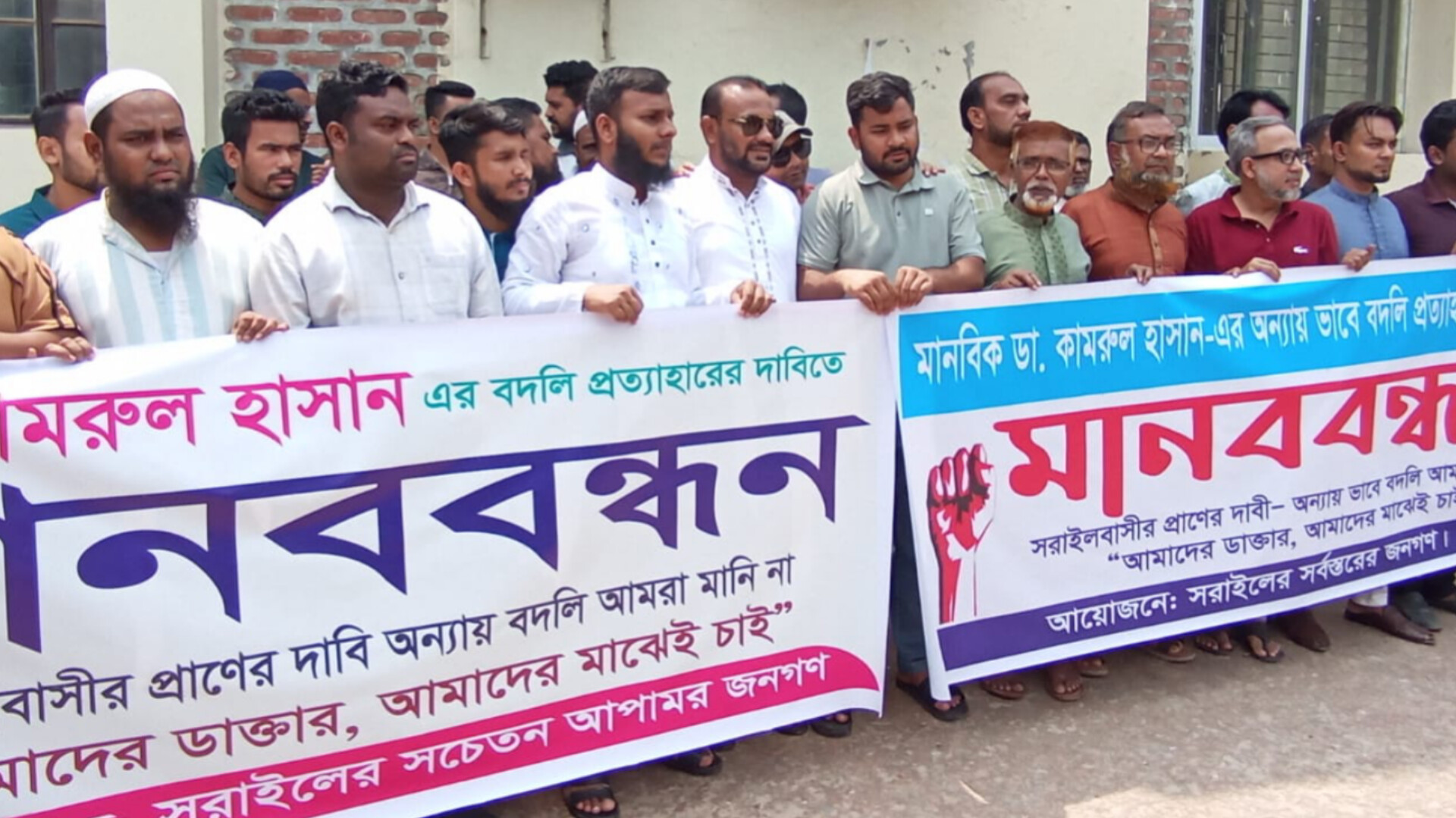 ব্রাহ্মণবাড়িয়ার সরাইলে উপজেলা স্বাস্থ্য কমপ্লেক্সের আবাসিক চিকিৎসক ডা. কামরুল হাসানের বদলি আদেশ প্রত্যাহারের দাবিতে মানববন্ধন অনুষ্ঠিত হয়েছে।