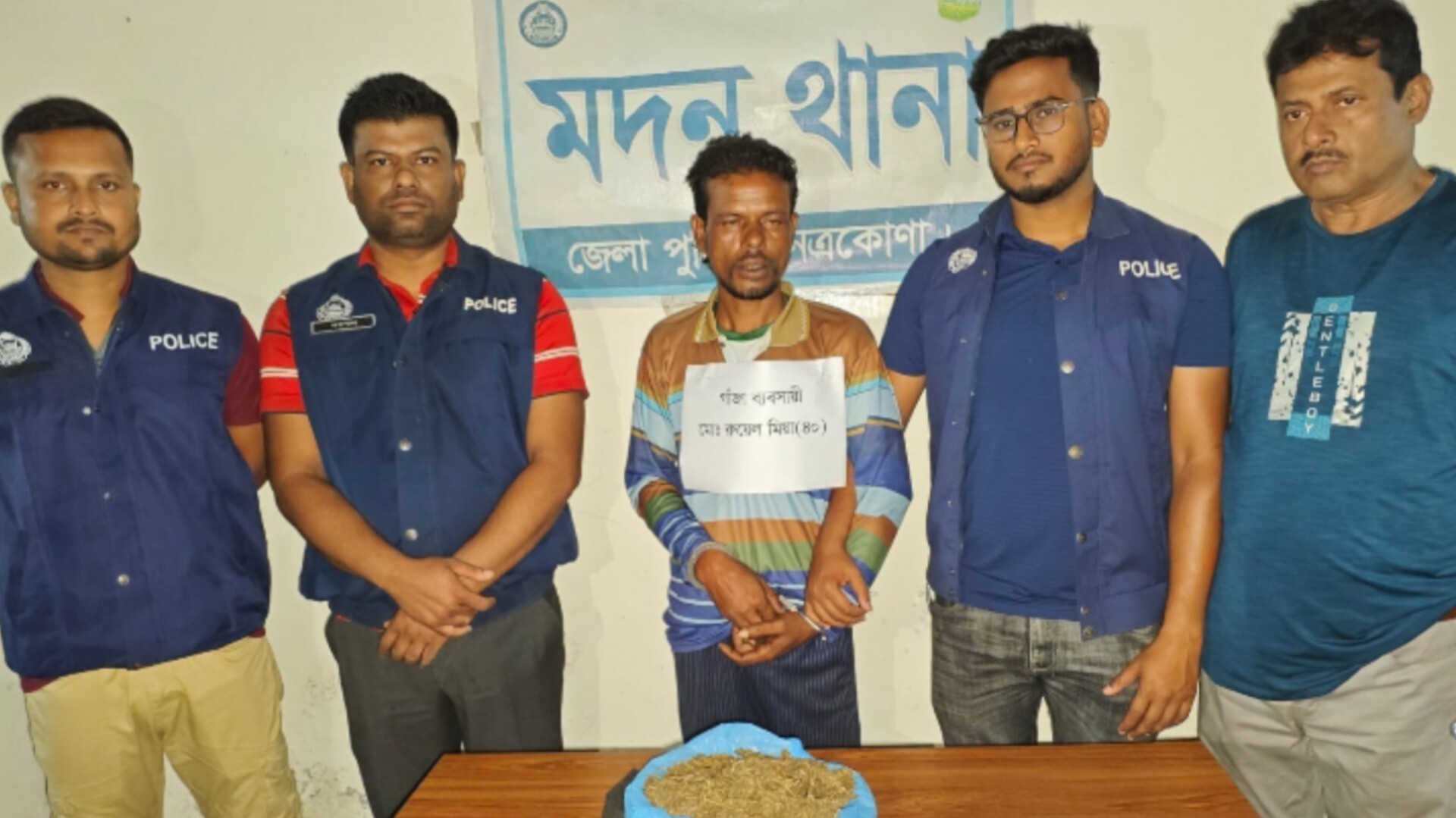 পুলিশ সূত্রে জানা যায়, মদন থানার এসআই ফয়সাল সঙ্গীয় ফোর্স নিয়ে গোপন সংবাদের ভিত্তিতে অভিযান চালান। অভিযানে রুয়েল মিয়ার বসতঘর তল্লাশি করে ৩৪০ গ্রাম গাঁজা উদ্ধার করা হয় এবং তাকে ঘটনাস্থল থেকে আটক করা হয়।
