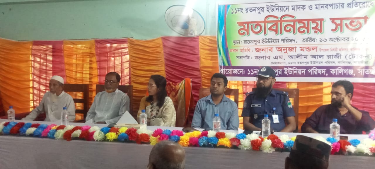 সাতক্ষীরার কালীগঞ্জ উপজেলার ১১নং রতনপুর ইউনিয়ন পরিষদের উদ্যোগে মাদক ও মানবপাচার প্রতিরোধে এক মতবিনিময় সভা অনুষ্ঠিত হয়েছে। বৃহস্পতিবার (১৬ অক্টোবর) সকাল ১১টায় ইউনিয়ন পরিষদ মিলনায়তনে এ সভার আয়োজন করা হয়।