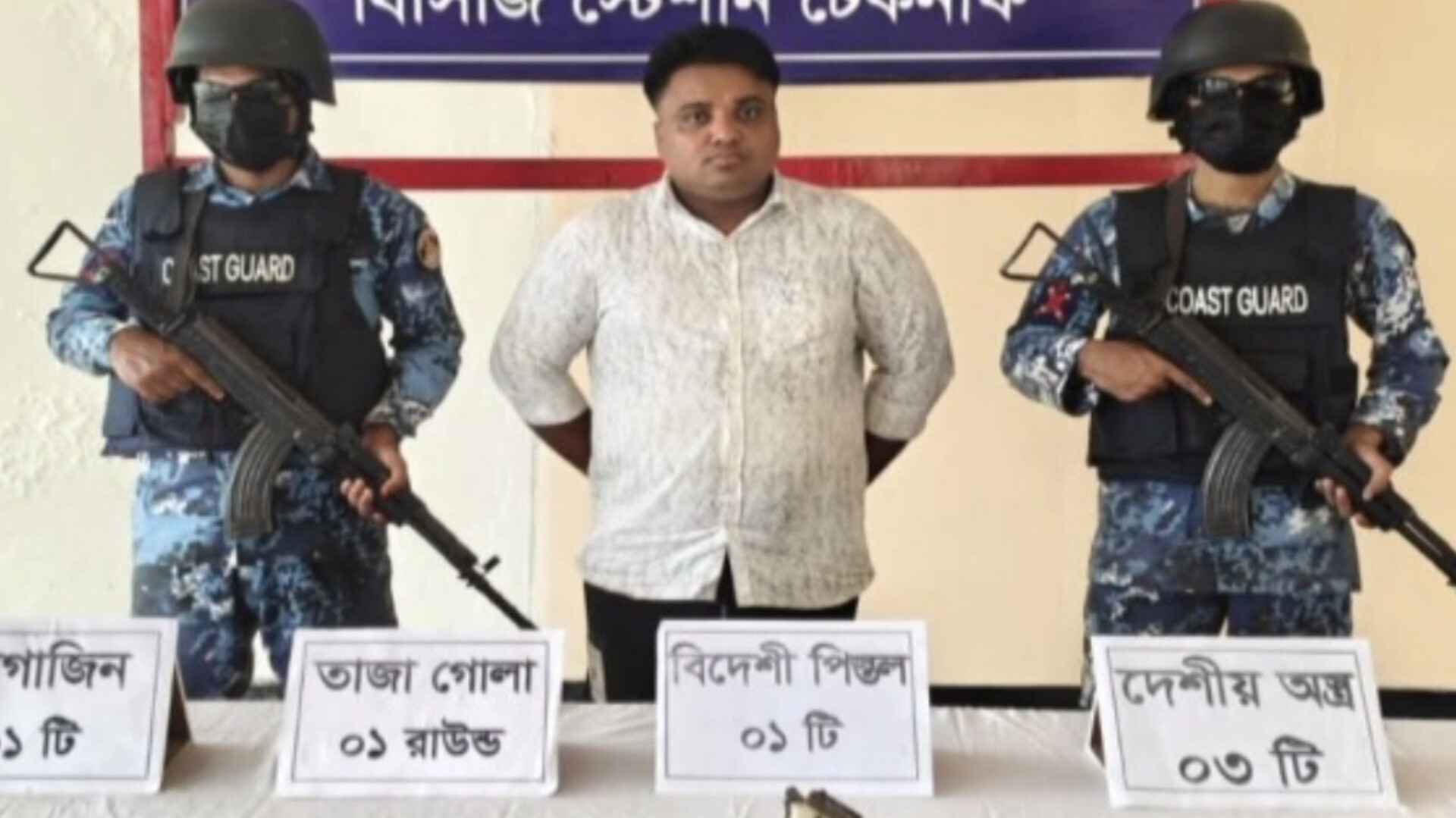 কক্সবাজারের টেকনাফে বিদেশি পিস্তল, তাজা গোলা ও দেশীয় অস্ত্রসহ এক কুখ্যাত সন্ত্রাসীকে আটক করেছে বাংলাদেশ কোস্ট গার্ড।