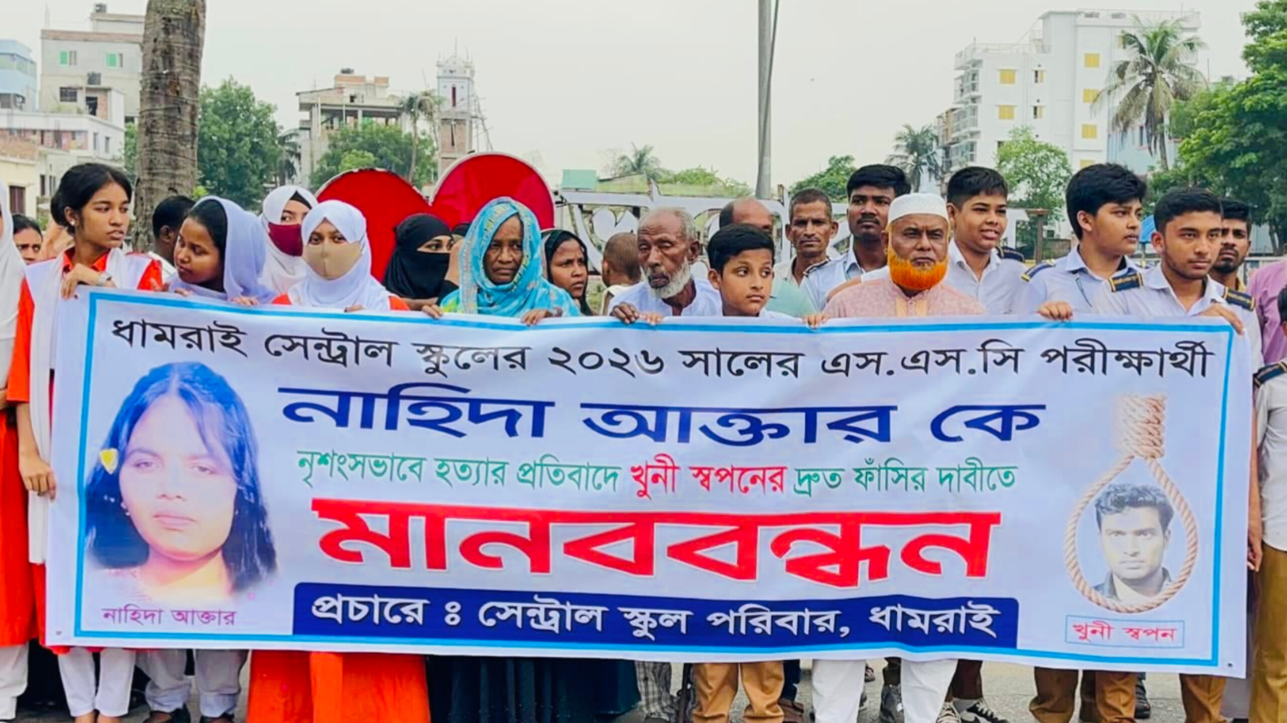 ঢাকার ধামরাইয়ে এসএসসি পরীক্ষার্থী নাহিদা আক্তার হত্যার ঘটনায় জড়িতদের সর্বোচ্চ শাস্তির দাবিতে মানববন্ধন অনুষ্ঠিত হয়েছে।