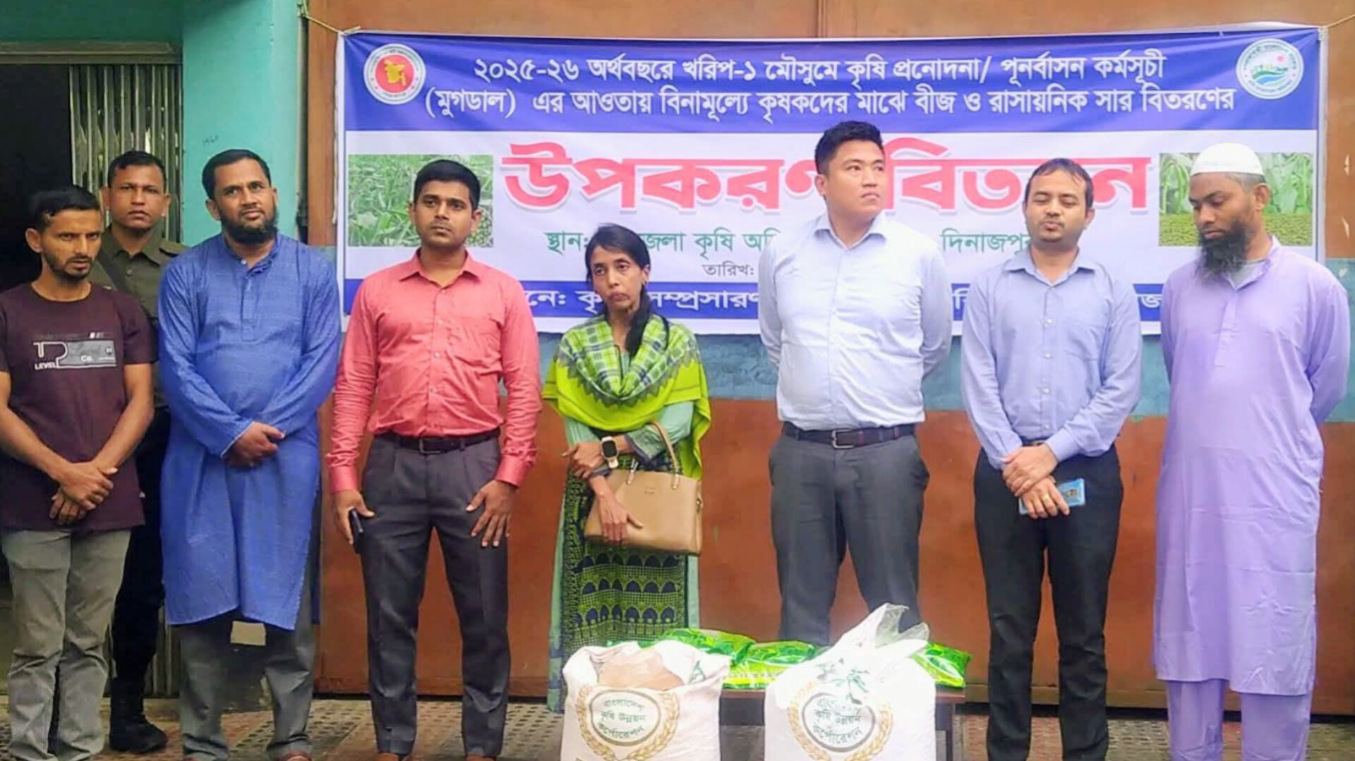 দিনাজপুরের হাকিমপুর উপজেলায় ২০২৫-২৬ অর্থবছরের খরিপ-১ মৌসুমে কৃষি প্রণোদনা কর্মসূচির আওতায় প্রান্তিক কৃষকদের মাঝে বিনামূল্যে মুগডাল বীজ ও রাসায়নিক সার বিতরণ করা হয়েছে।