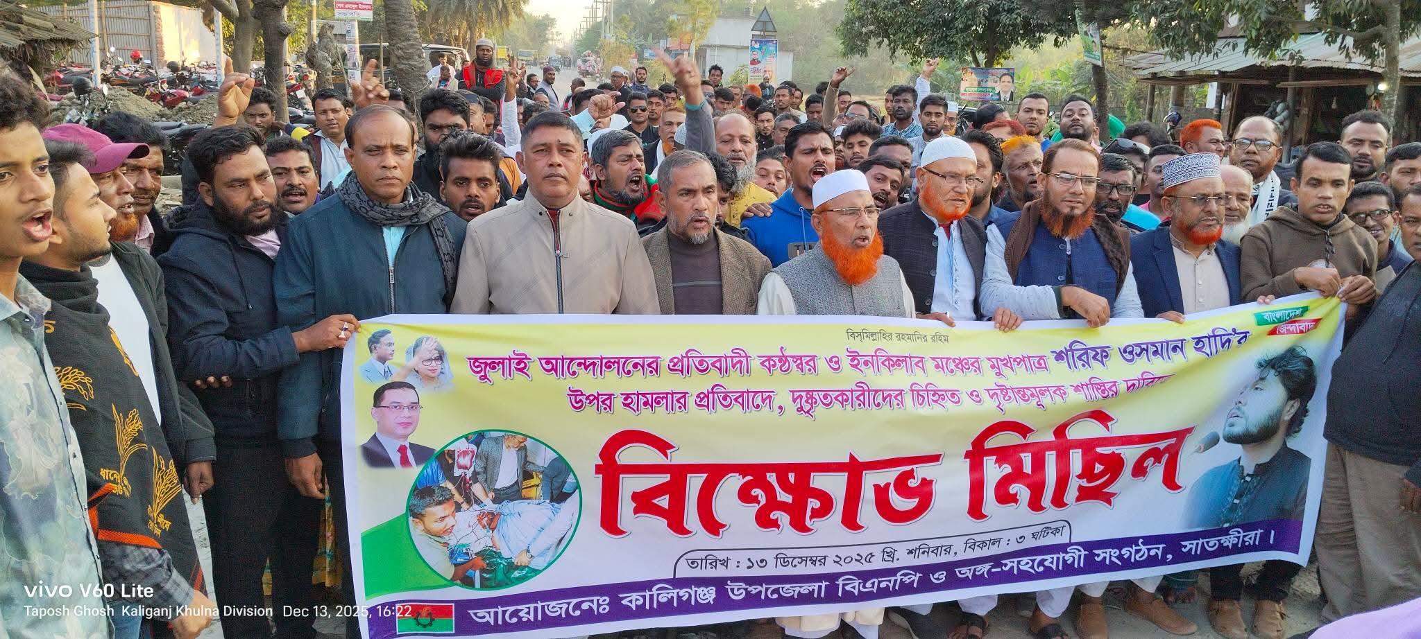 সাতক্ষীরার কালিগঞ্জ উপজেলা বিএনপির উদ্যোগে জুলাই আন্দোলনের প্রতিবাদী কণ্ঠস্বর ও ইনকিলাব মঞ্চের মুখপাত্র শরিফ ওসমান হাদির ওপর বর্বর হামলার তীব্র প্রতিবাদ জানিয়ে এবং দুষ্কৃতকারীদের দ্রুত চিহ্নিত করে গ্রেফতার ও দৃষ্টান্তমূলক শাস্তির দাবিতে বিক্ষোভ সমাবেশ অনুষ্ঠিত হয়েছে। শনিবার (১৩ ডিসেম্বর ) বিকাল সাড়ে ৪ টায় একটি বিক্ষোভ মিছিল উপজেলার প্রধান প্রধান সড়ক প্রদক্ষিণ করে মিছিলটি উপজেলা বিএনপির কার্যালয়ের সামনে গিয়ে শেষ হয়। মিছিল শেষে উক্ত সমাবেশে প্রধান অতিথি হিসেবে উপস্থিত সাতক্ষীরা-৩ আসনের বিএনপির মনোনীত ধানের শীষের প্রার্থী , বিএনপি'র কেন্দ্রীয় নির্বাহী কমিটির সদস্য কাজী আলাউদ্দিন। কালিগঞ্জ উপজেলা বিএনপি ও এর অঙ্গ-সহযোগী সংগঠনের বিপুল সংখ্যক নেতাকর্মী , সমর্থক এ সমাবেশে অংশগ্রহণ করেন। এ সময় নেতাকর্মীরা শরিফ ওসমান হাদির ওপর হামলার বিচার চাই”, গণতন্ত্রকামী কণ্ঠস্বর দমন চলবে না, “হামলাকারীদের অবিলম্বে গ্রেপ্তার কর-এমন বিভিন্ন স্লোগানে স্লোগানে রাজপথ প্রকম্পিতি উঠে। সংক্ষিপ্ত সমাবেশে বক্তারা বলেন, জুলাই আন্দোলনের প্রতিবাদী কণ্ঠস্বর শরিফ ওসমান হাদির ওপর হামলা গণতন্ত্র ও মতপ্রকাশের স্বাধীনতার ওপর সরাসরি আঘাত। একটি পরিকল্পিত মহল গণতন্ত্রকামী ও প্রতিবাদী কণ্ঠস্বর দমন করতে এ ধরনের বর্বর হামলা চালাচ্ছে। বক্তারা আরও বলেন, হামলাকারীরা যদি দ্রুত গ্রেপ্তার ও দৃষ্টান্তমূলক শাস্তির আওতায় না আসে, তাহলে দেশব্যাপী কঠোর আন্দোলন গড়ে তোলা হবে বলে হুঁশিয়ারি উচ্চারণ করেন। একই সঙ্গে আইনশৃঙ্খলা রক্ষাকারী বাহিনীর প্রতি নিরপেক্ষ তদন্তের দাবি জানান তারা।