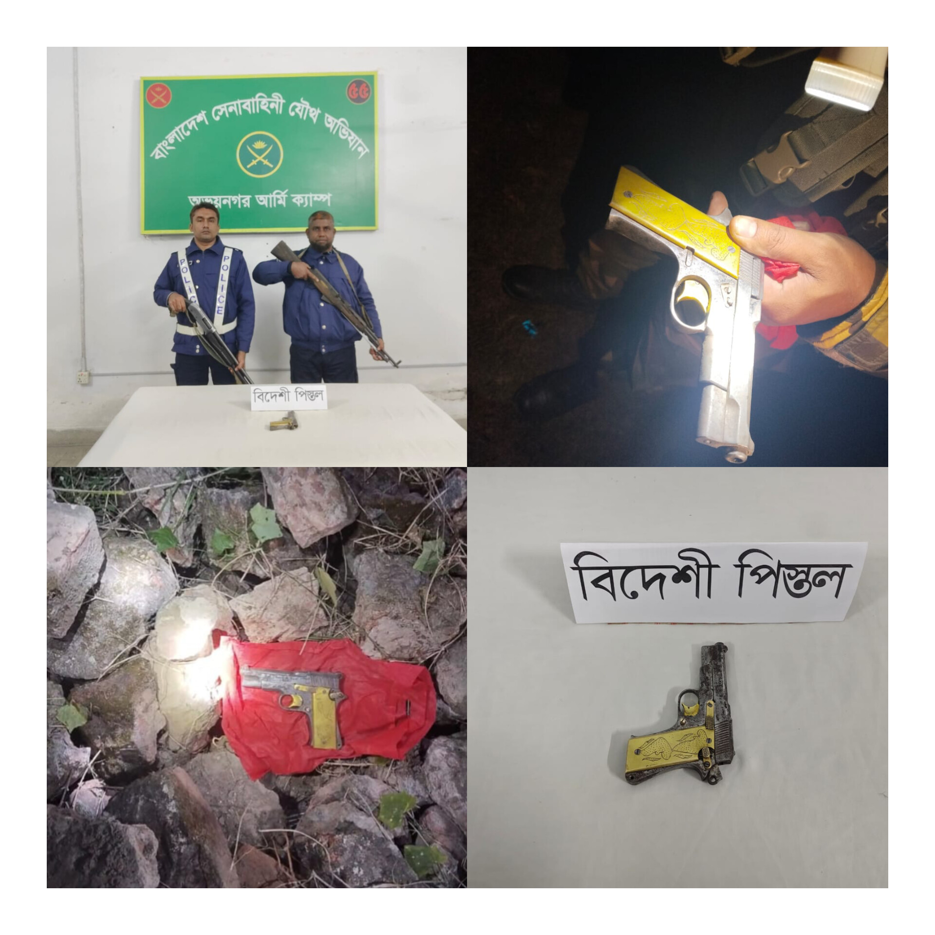 যশোরের অভয়নগর উপজেলার নওয়াপাড়ার বউ বাজার এলাকায় গভীর রাতে বিশেষ অভিযান চালিয়ে একটি পরিত্যক্ত বিদেশি পিস্তল উদ্ধার করেছে আইনশৃঙ্খলা বাহিনী। উদ্ধার হওয়া অস্ত্রটি যুক্তরাষ্ট্রে তৈরি (ইউএসএ) বলে প্রাথমিকভাবে নিশ্চিত করেছেন সংশ্লিষ্ট কর্মকর্তারা। গোয়েন্দা সূত্রের দাবি, উদ্ধারকৃত পিস্তলটি এলাকার চিহ্নিত মাদক ব্যবসায়ী রুহুল আমিনের।
