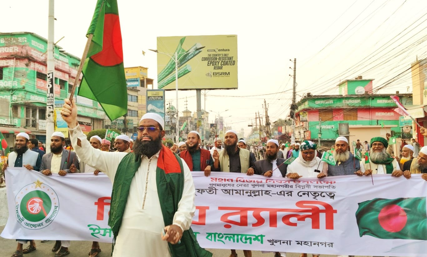 মঙ্গলবার (১৬ ডিসেম্বর) বিকাল ৩ টায় নগরীর পাওয়ার হাউজ মোড়ে ইসলামী আন্দোলন বাংলাদেশ খুলনা মহানগর এর উদ্যোগে মহান বিজয় দিবস উপলক্ষে র্যালী পূর্ব সমাবেশ ইসলামী আন্দোলন বাংলাদেশ খুলনা মহানগর সভাপতি ও খুলনা ২ আসনের সংসদ সদস্য পদপ্রার্থী আলহাজ্ব মুফতী আমানুল্লাহ'র সভাপতিত্বে ও সেক্রেটারী মুফতী ইমরান হোসাইন এর পরিচালনায় অনুষ্ঠিত হয়।