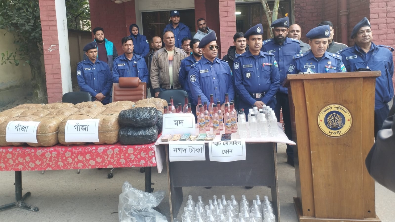 নওগাঁ শহরের হরিজন সুইপার কলোনিতে সাংবাদিকদের সাথে নিয়ে নওগাঁ সদর থানা পুলিশ ও জেলা গোয়েন্দা শাখা (ডিবি) এর প্রায় ৩ ঘন্টা ব্যাপী যৌথ বিশেষ অভিযানে প্রায় ৭০ কেজি গাঁজা ১৬ লিটার ৬০০ মিলি বাংলা মদ তারা মজুত করে বোতল জাত করতো। খালি মদের বোতল ও বোতলের কর্ক পাশাপাশি মদক বিক্রির টাকা নগদ টাকা ০১ লক্ষ ৯৮ হাজার অভিযানেকালে জব্দ করা হয়। আজ রোববার সকাল ০৯ ঘটিকা হতে সাড়ে ১২ ঘটিকা পর্যন্ত অভিযান পরিচালনা করে ০২ জনকে আটক করা হয়।আটককৃত ব্যাক্তিরা হলেন, ১। রাহুল (১৯), পিতা- ভবেষ বাঁসখোর, ২। রাজা বাঁসখোর(৩৭), পিতা-শ্রী ভানু বাঁসখোর, উভয় সাং- নুনীয়া পট্রি, সুইপার কলোনী, থানা ও জেলা নওগাঁ।থানা পুলিশ সূত্রে জানা যায়- গোপন সংবাদের ভিত্তিত্বে শহরের হরিজন সুইপার কলোনিতে সকাল ০৯ ঘটিকায় মৃত ভানুর ছেলে মনির বাড়িতে সদর থানা পুলিশ অভিযান পরিচালনা করে। তবে ঘরটি তালাবদ্ধ থাকায় ঘরের তালা ভেঙে গাঁজা উদ্ধার করা হয়। পুলিশের অভিযানের আগে মাদক ব্যবসায়িরা বুঝতে পেরে কিছু গাঁজার প্যাকেজ পাশের পুকুরে পানিতে ফেলে দেয়। পরে সেগুলো উদ্ধার করা হয়। পরে জেলা পুলিশ সুপার তারিকুল ইসলাম ঘটনাস্থল পরিদর্শন করেন। এসময় জেলা গোয়েন্দা শাখা(ডিবি) পুলিশ অভিযানে যোগ দেয়। প্রতিটি বাসায় তল্লাসি চালানো হয়। এসময় কিছু বাংলা মদ উদ্ধার করা হয়।মাদকমুক্ত করতে এ ধরণের অভিযান নিয়মিত পরিচালনা করা হবে বলে জানান জেলা পুলিশ সুপার তারিকুল ইসলাম।