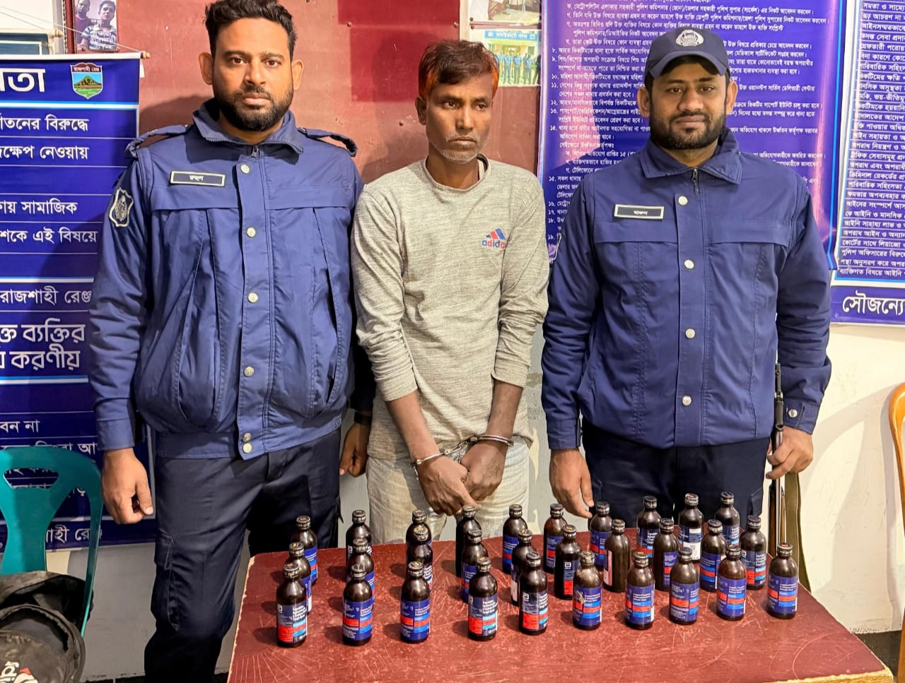 নওগাঁর ধামইরহাটে থানা পুলিশের অভিযানে ৩০ বোতল নেশাজাতীয় মাদকদ্রব্যসহ একজন মাদক কারবারিকে আটক করেছে পুলিশ। শনিবার (২১ ডিসেম্বর ২০২৫) রাতে ধামইরহাট থানাধীন পৌরসভার ধামইরহাট-ঢাকা বাসস্ট্যান্ড এলাকার যাত্রী ছাউনির সামনে এ অভিযান পরিচালনা করা হয়।