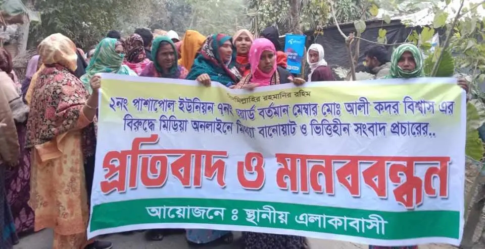 যশোরের চৌগাছা উপজেলার পাশাপোল ইউনিয়নের ৭ নম্বর ওয়ার্ডের ইউপি সদস্য আলী কদর বিশ্বাসের বিরুদ্ধে কিছু অনলাইন মিডিয়ায় প্রকাশিত মিথ্যা, বানোয়াট ও ভিত্তিহীন সংবাদের প্রতিবাদে মানববন্ধন করেছে স্থানীয় এলাকাবাসী। রবিবার (২৮ ডিসেম্বর) বিকেল চারটায় পাশাপোলের হাউলী গ্রামের ঝাউতলা এলাকায় এ মানববন্ধন অনুষ্ঠিত হয়।