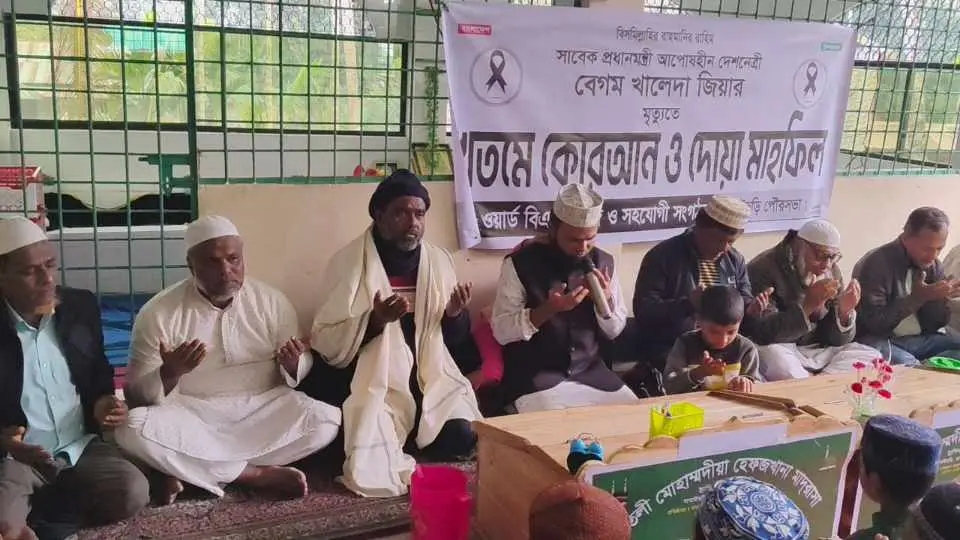 মোনাজাত শেষে সংক্ষিপ্ত আলোচনায় বক্তারা মরহুমা বেগম খালেদা জিয়ার বর্ণাঢ্য রাজনৈতিক জীবনের অবদান গভীর শ্রদ্ধার সঙ্গে স্মরণ করেন। বক্তারা বলেন, বেগম খালেদা জিয়া ছিলেন দেশের গণতন্ত্র পুনরুদ্ধার আন্দোলনের এক অবিস্মরণীয় নেত্রী। গণতন্ত্র, ভোটাধিকার ও মানুষের মৌলিক অধিকার প্রতিষ্ঠায় তিনি আজীবন আপসহীন সংগ্রাম চালিয়ে গেছেন।