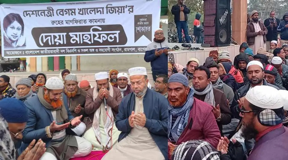 বাগেরহাট রামপালে সাবেক প্রধানমন্ত্রী ও বাংলাদেশের প্রথম নারী প্রধানমন্ত্রী বেগম খালেদা জিয়ার রুহের মাগফিরাত কামনায় দোয়া ও মিলাদ মাহফিল অনুষ্ঠিত হয়েছে।