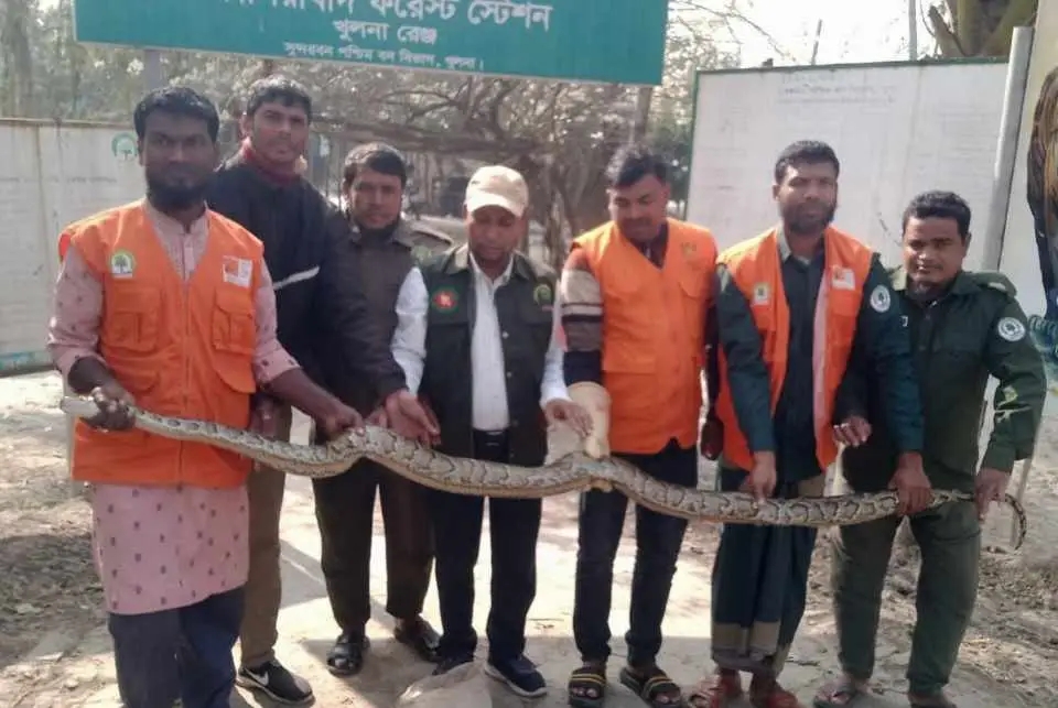 ১০ ফুট লম্বা একটি অজগার সাপ উদ্ধার করেছে বন বিভাগ।উদ্ধার করা সাপটি পরে সুন্দরবনে অবমুক্ত করা হয়েছে।