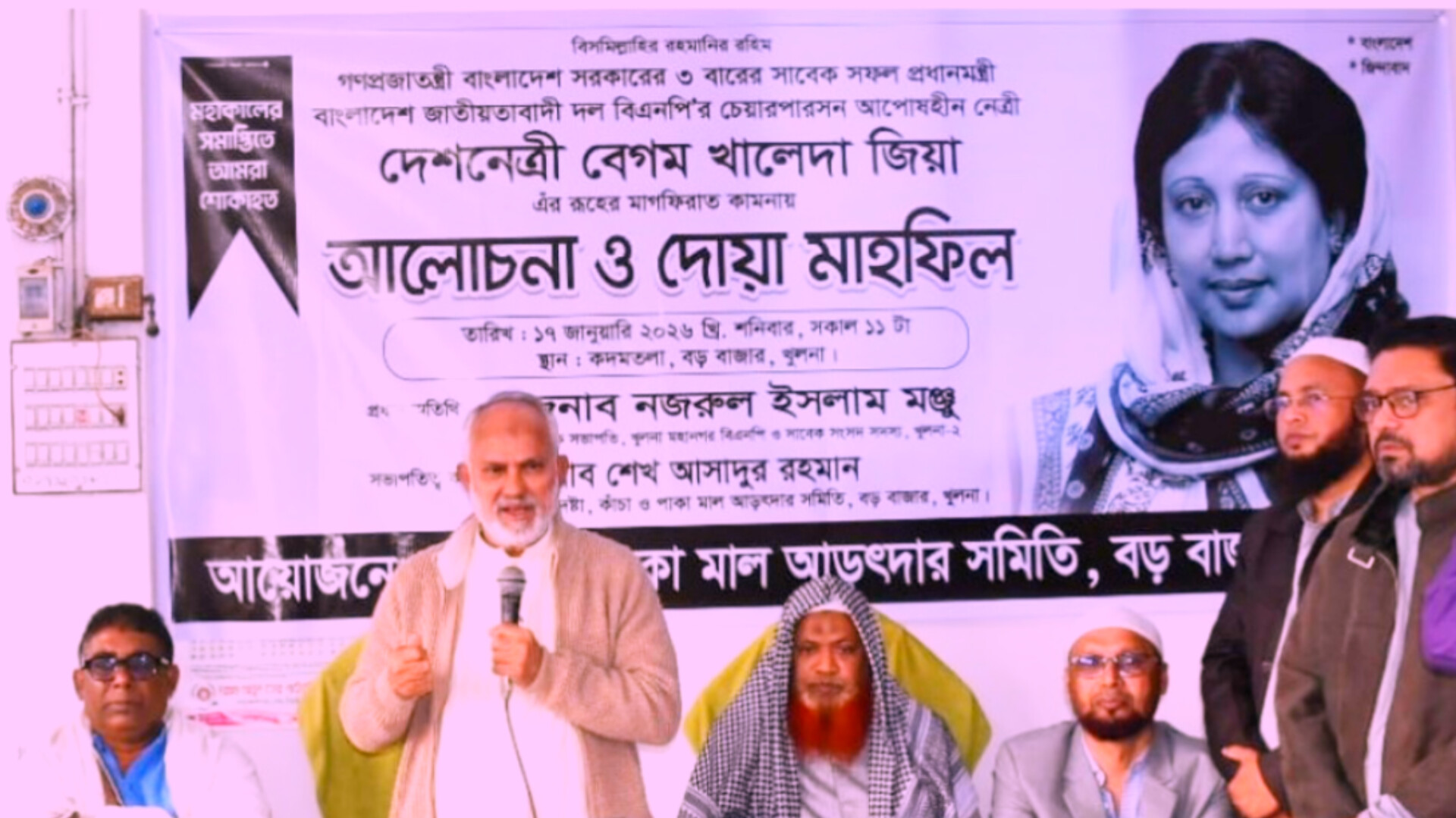 শনিবার (১৭ জানুয়ারি) বেলা ১২ টায় খুলনা বড় বাজার কাঁচা ও পাকা মাল আড়ৎদার সমিতির উদ্যোগে সাবেক প্রধানমন্ত্রী ও বিএনপির চেয়ারপার্সন মরহুমা বেগম খালেদা জিয়ার রূহের মাগফেরাত কামনায় আলোচনা সভা ও দোয়া মাহফিল অনুষ্ঠিত হয়। সমিতির উপদেষ্টা শেখ আসাদুর রহমানের সভাপতিত্বে এবং প্রচার সম্পাদক শেখ মোঃ নাসির উদ্দিনের পরিচালনায় আয়োজনটি সম্পন্ন হয়।